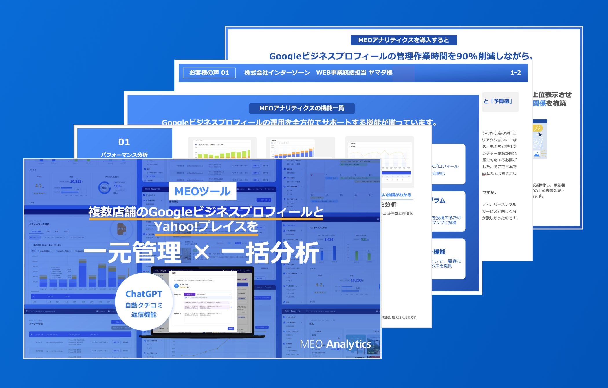 MEOアナリティクスは、Google ビジネスプロフィール(旧称:Google マイビジネス)で扱う情報の管理・分析効率を高め、運用に伴う作業の課題を解消するツールです。MEO対策・運用代行のプロ集団であるオルグロー株式会社が、「本当に必要な機能だけを搭載した、シンプルで誰でも使えるものを自分達で作ろう」という思いのもと開発しました。